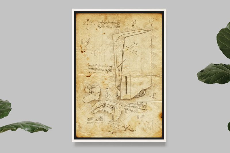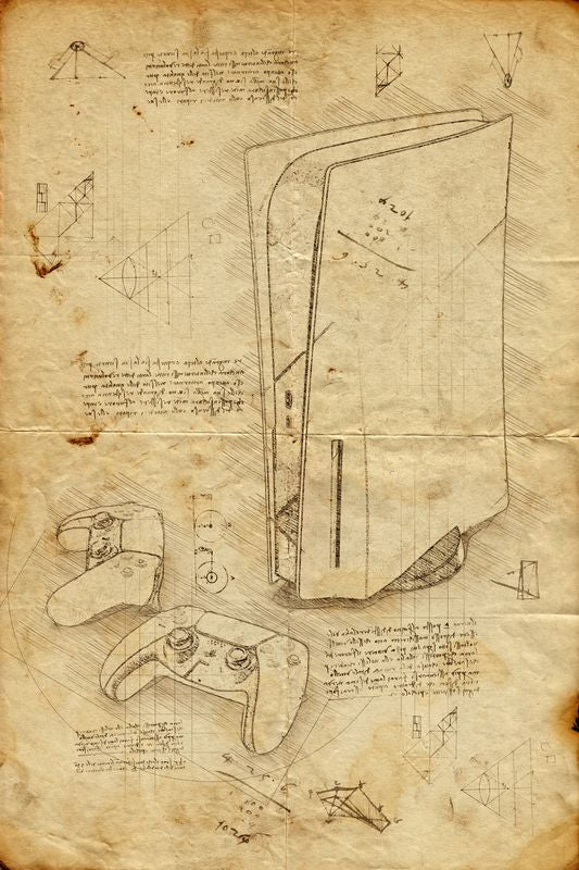Voici une illustration de la toute nouvelle console de jeu Sony PS5, digne des plus grandes oeuvres de Leonardo da Vinci. La finesse et la précision de chaque détail de la console sont mises en valeur dans cette oeuvre d'art.
