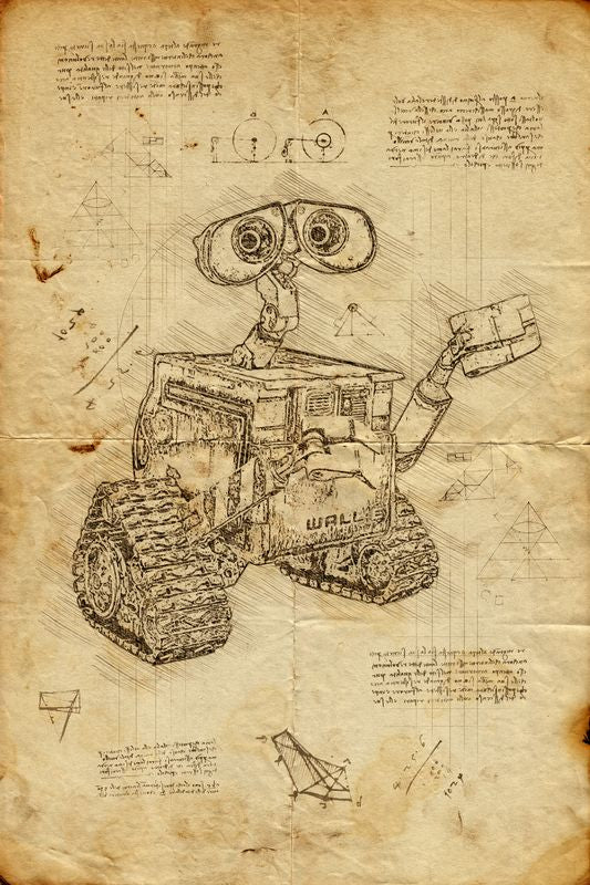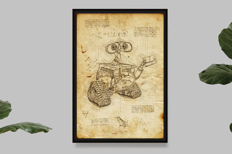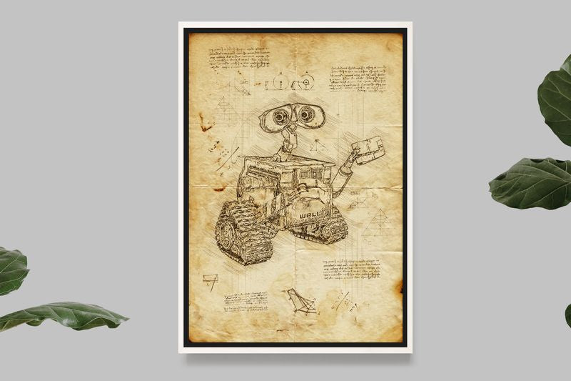 Vous cherchez une illustration originale et unique pour votre décoration intérieure ? Ne cherchez plus ! Voici une illustration de Wall-E, le robot romantique et touchant de l'univers Pixar, dans un style Da Vinci.